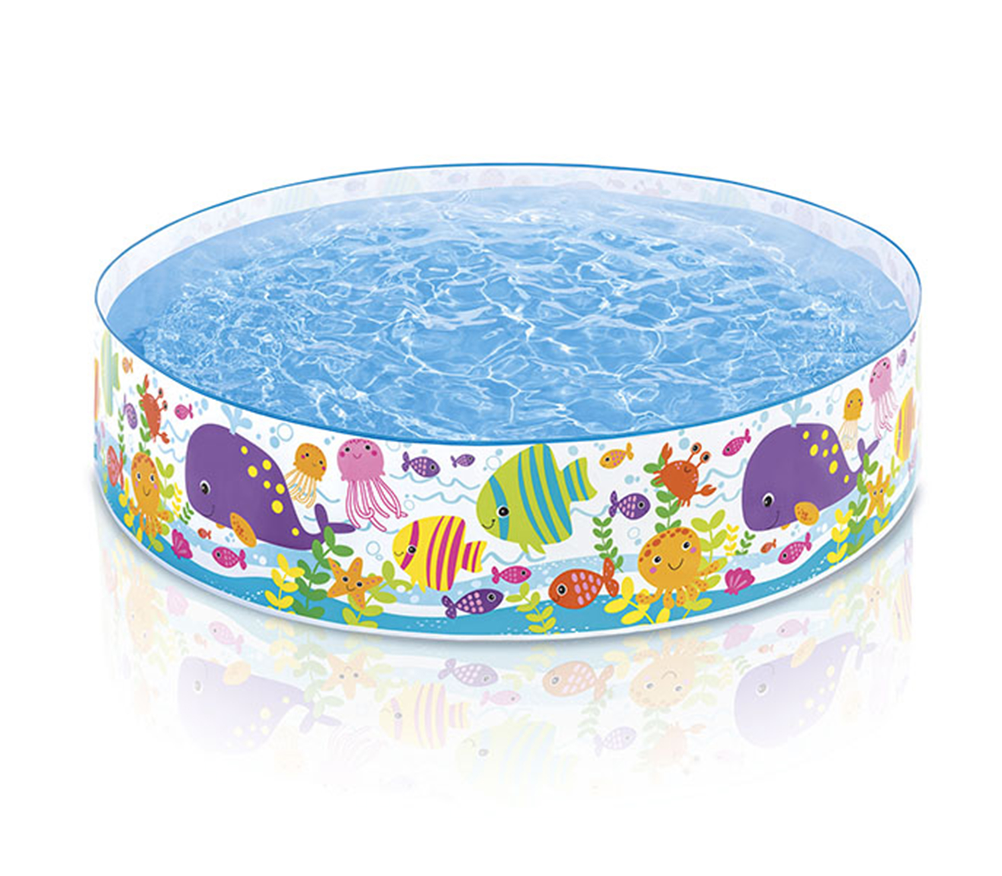 Детский бассейн "Ocean Play Snapset Pool" Intex 56452 - круглый бассейн рассчитан на детей от 3-х лет и старше и обладает большой вместимостью. На нем изображены рыбки, черепахи и морские звезды. Этот бассейн можно смело рекомендовать, если у вас на участке есть домашние животные. Стенки сделаны из плотного материла (они не надуваются). Конструкция водораспорная. Если беспокоитесь о долговечности бассейна - это ваш выбор.